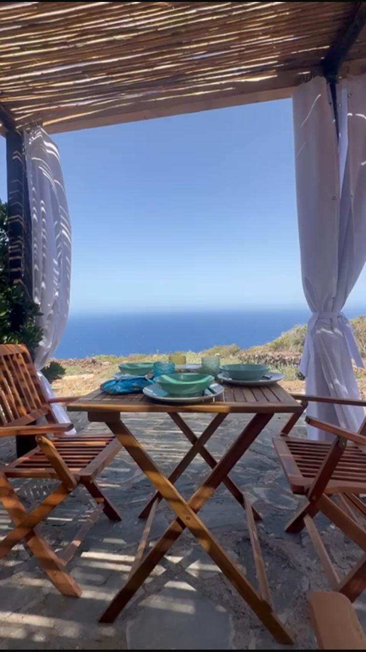 All'esterno, una piccola cucina in muratura invita a preparare pasti leggeri e colazioni deliziose. Accanto, un tavolino per due è posizionato sotto un pergolato in cannizzo, tipico dell'isola. Questo tetto naturale offre un'ombra delicata durante il giorno e un'atmosfera intima la sera, perfetta per cene romantiche con vista sul mare. I cuscini colorati appoggiati sulla pietra aggiungono un tocco di charme.