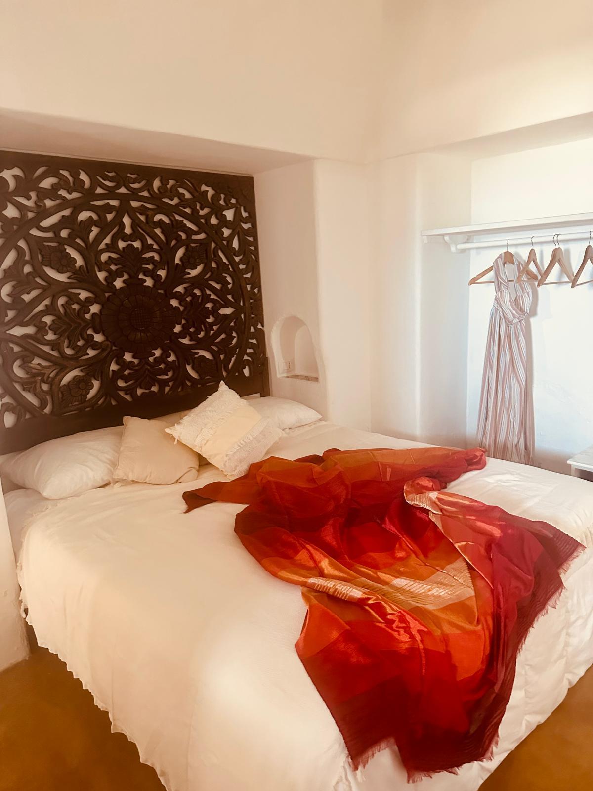 Immagina una piccola camera matrimoniale nel cuore del dammuso, accessibile dal soggiorno e dall'esterno. Un letto grande e invitante, vestito di lenzuola di seta rosse e cuscini vellutati, troneggia al centro della stanza, promettendo notti di riposo sereno e sogni romantici.