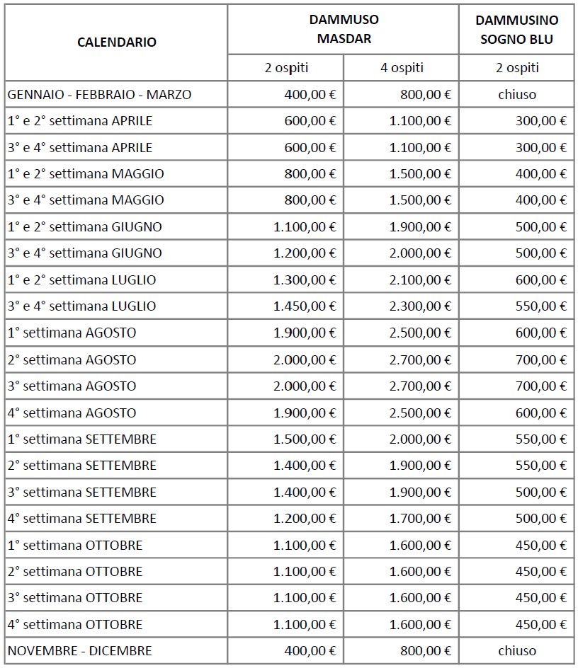 Le tariffe variano a seconda della stagione e della durata del soggiorno, sconti speciali per soggiorni prolungati e prenotazioni anticipate.